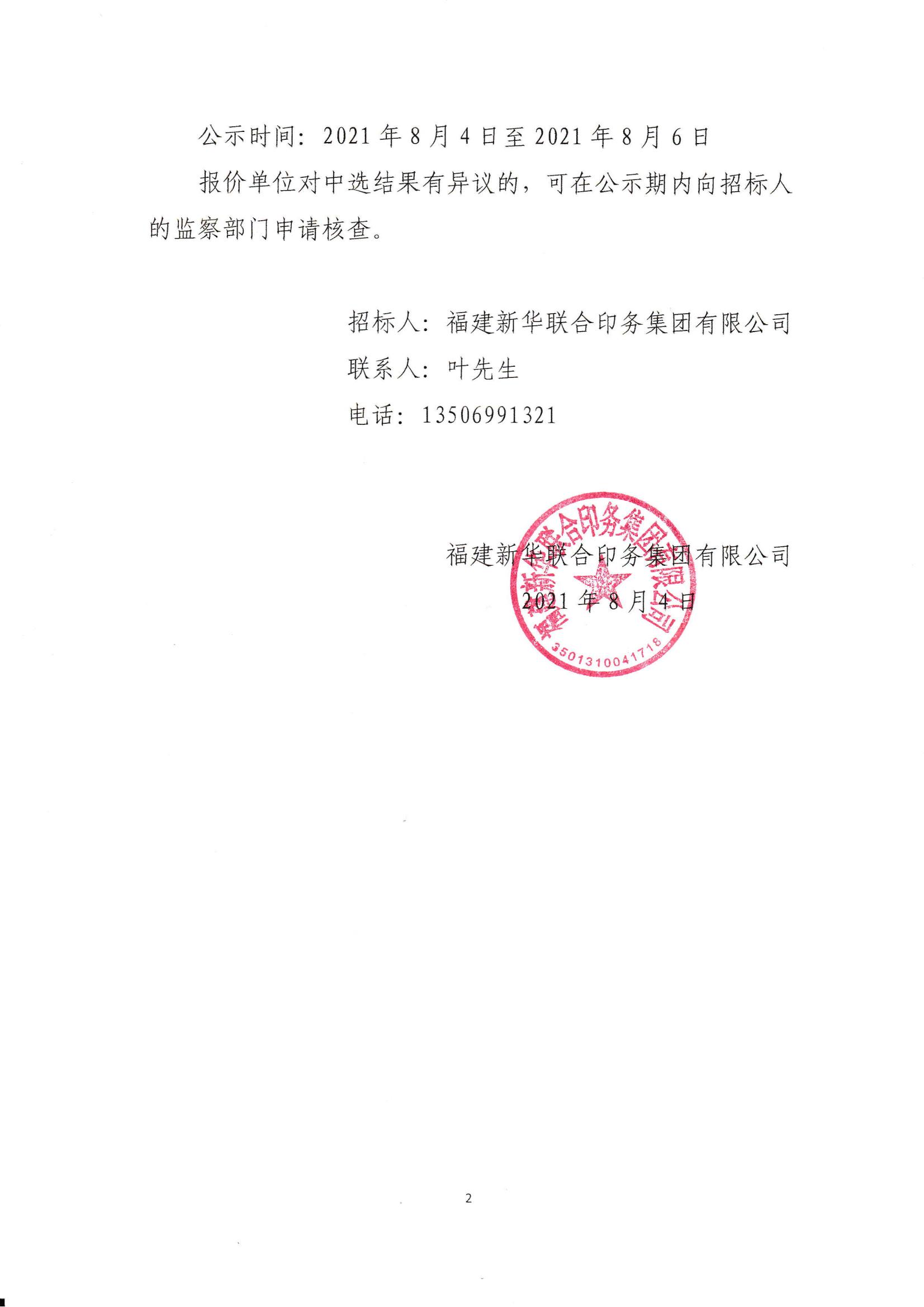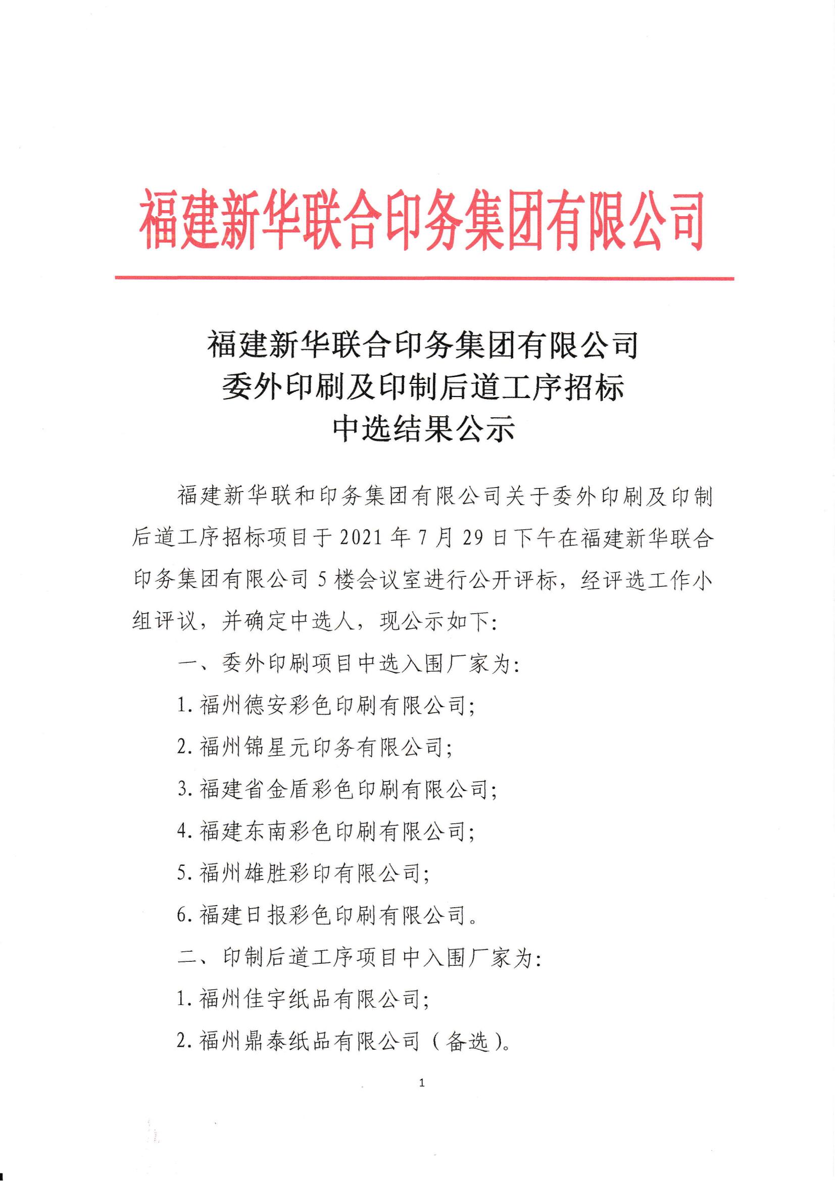 太阳集团tcy8722有限公司关于委外印刷及印制后道工序招标项目于2021年7月29日下午在福建新华联合 印务集团有限公司5楼会议室进行公开评标,经评选工作小组评议,并确定中选人,现公示如下: