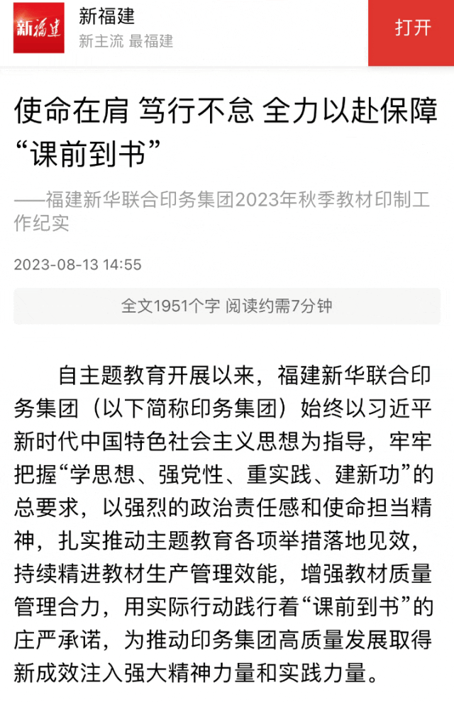 尺寸课本、国之大者。教材印制工作是学习贯彻习近平新时代中国特色社会主义思想主题教育的一次生动实践。眼下,2023年秋季教材印制工作已进入最后的冲刺阶段,印务集团将坚持重实践与求实效相促进,切实将党的创新理论转化为指导实践、推动工作的强大力量,全力以赴保障“课前到书”,在谱写中国式现代化福建篇章中展现更大作为、作出更大贡献。