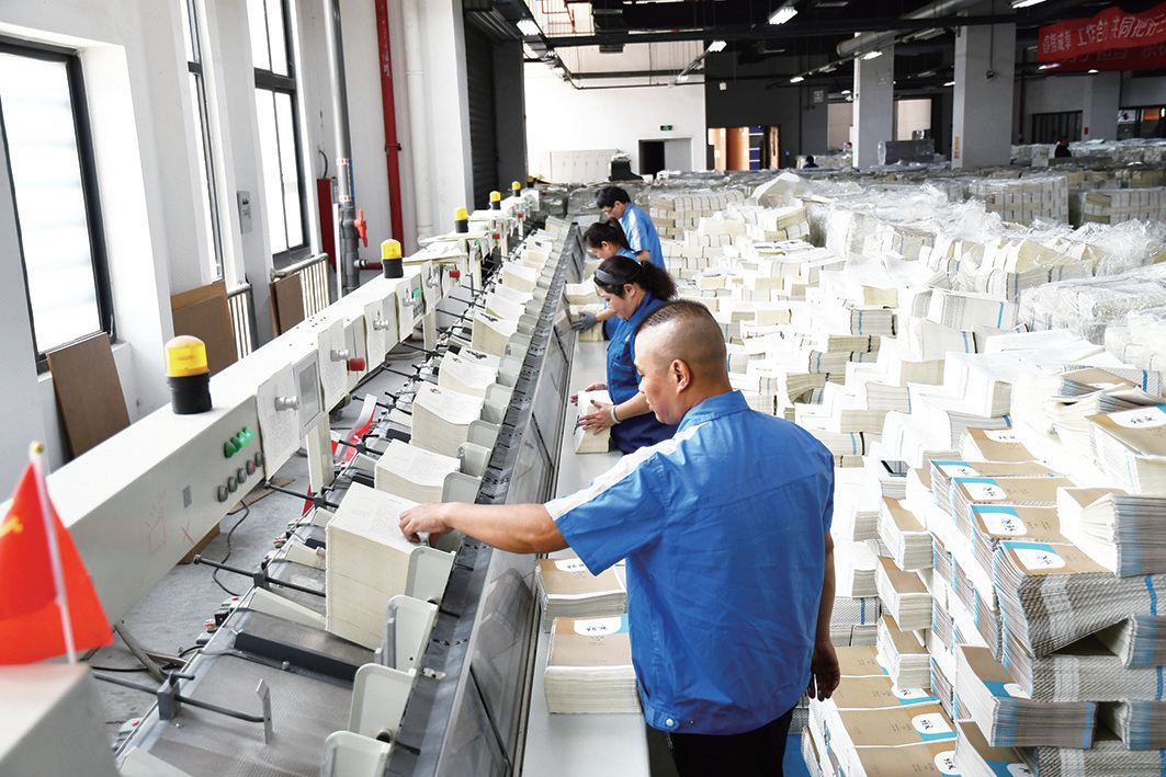 每逢教材印制高峰期,走进位于福建省福州市晋安区后屿路6号的海峡印刷创意园,都能看到印制车间灯光通明,机器彻夜运转。太阳集团tcy8722全体员工铆足干劲抢进度,开足马力抓生产,在“比、学、赶、超、帮”的浓烈生产氛围中,不断刷新每天的产量纪录。