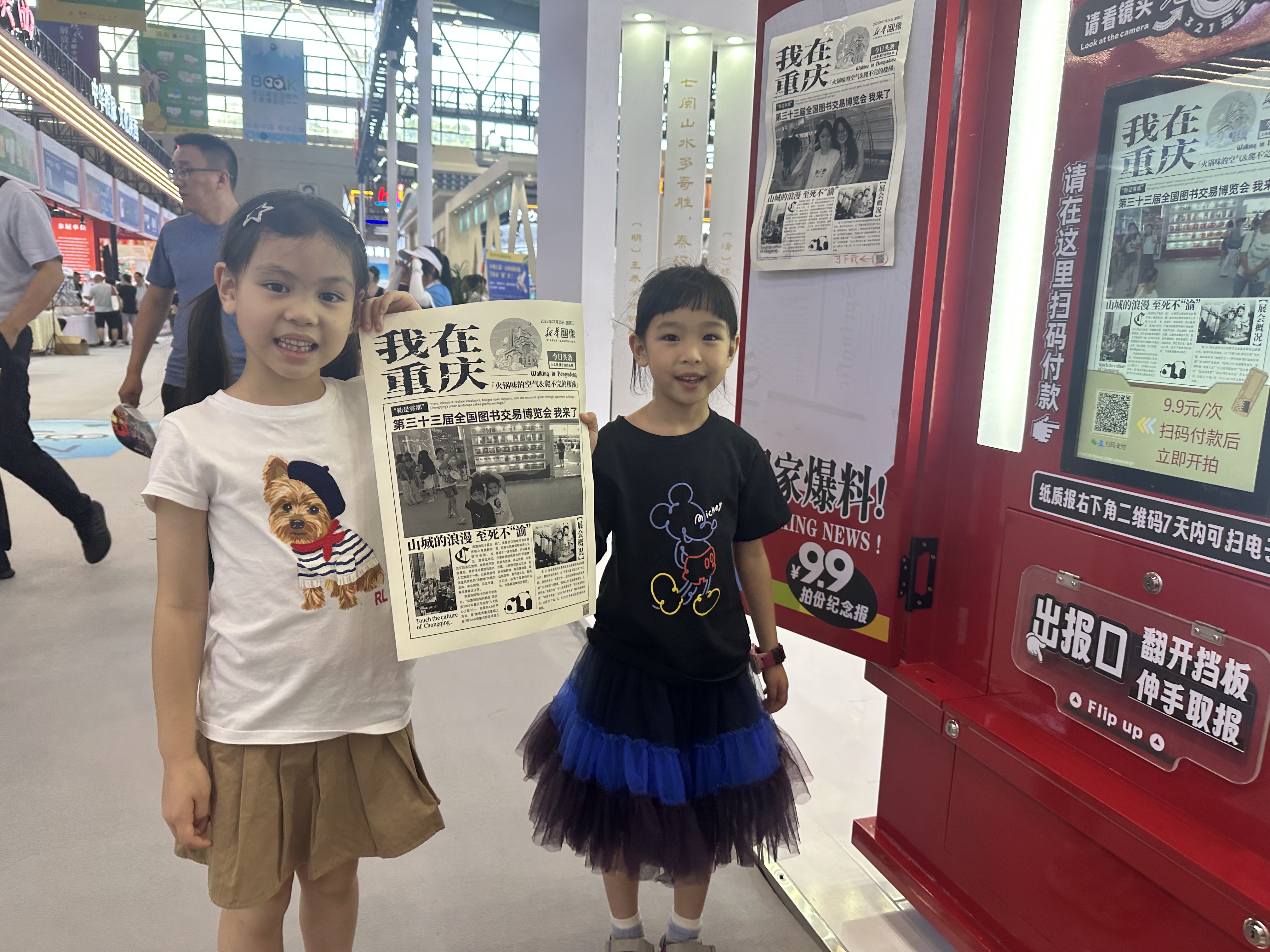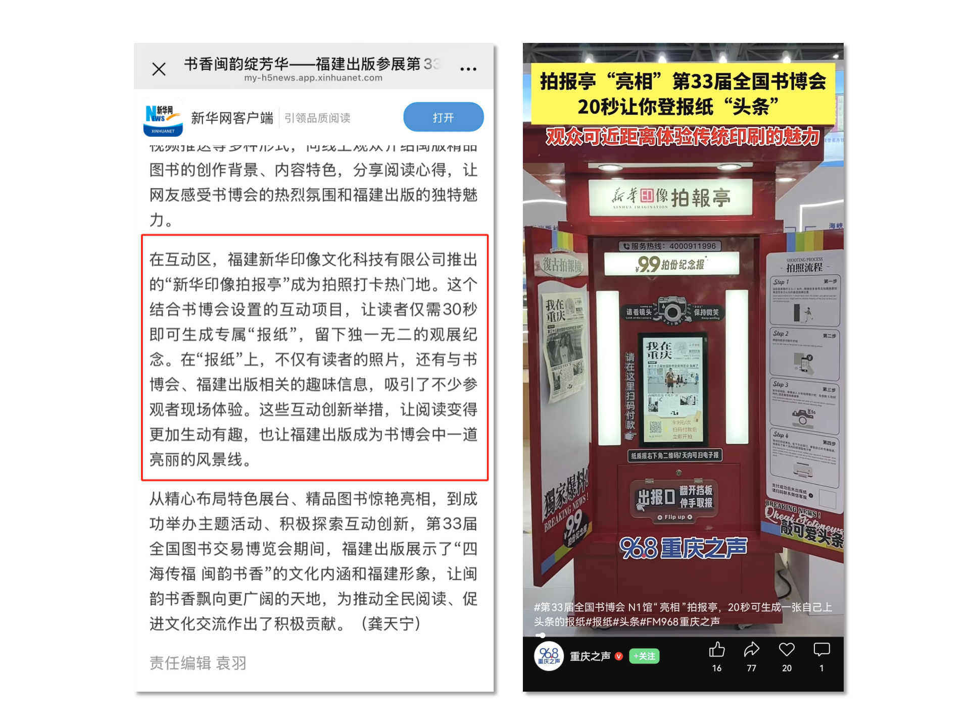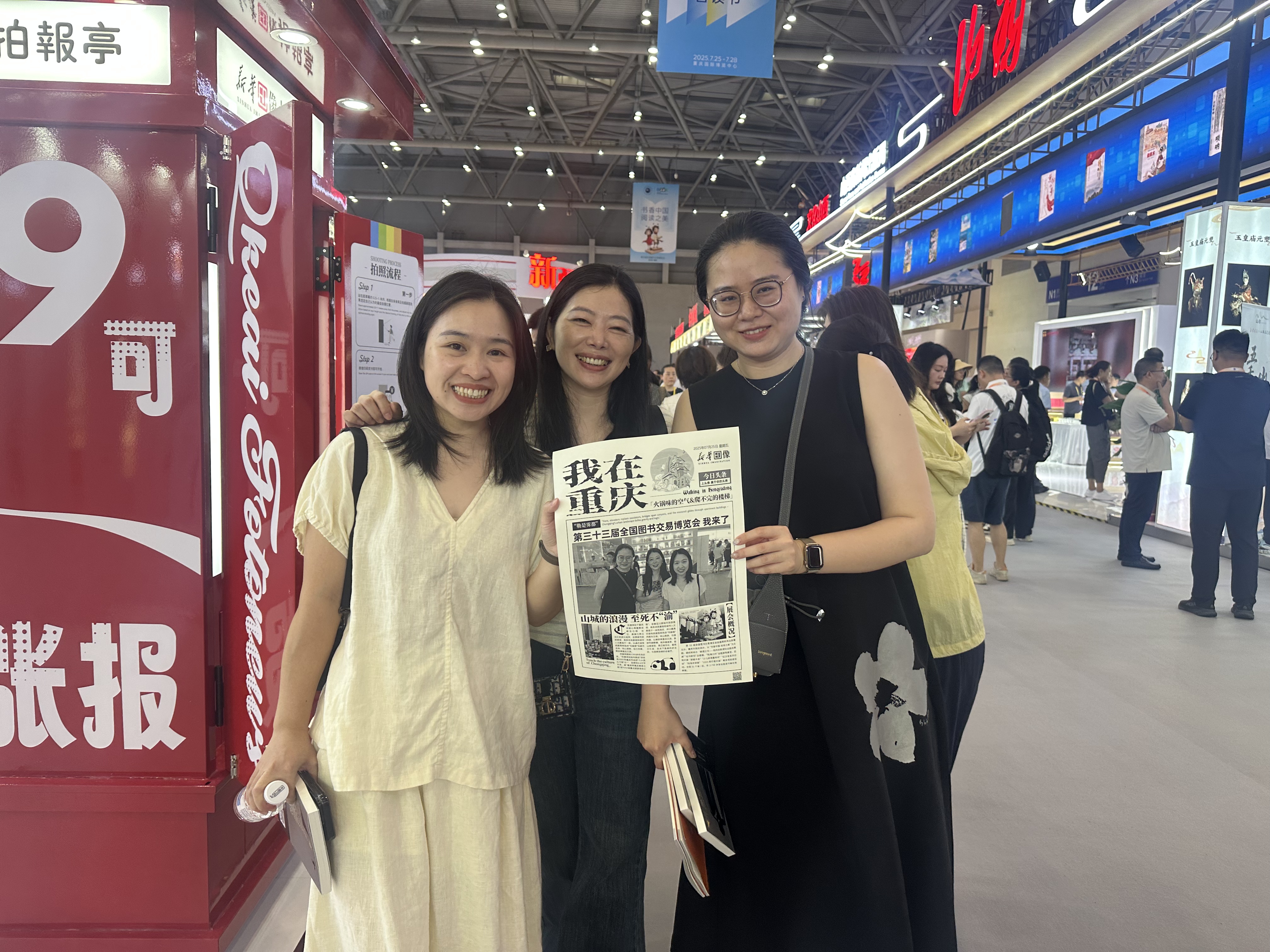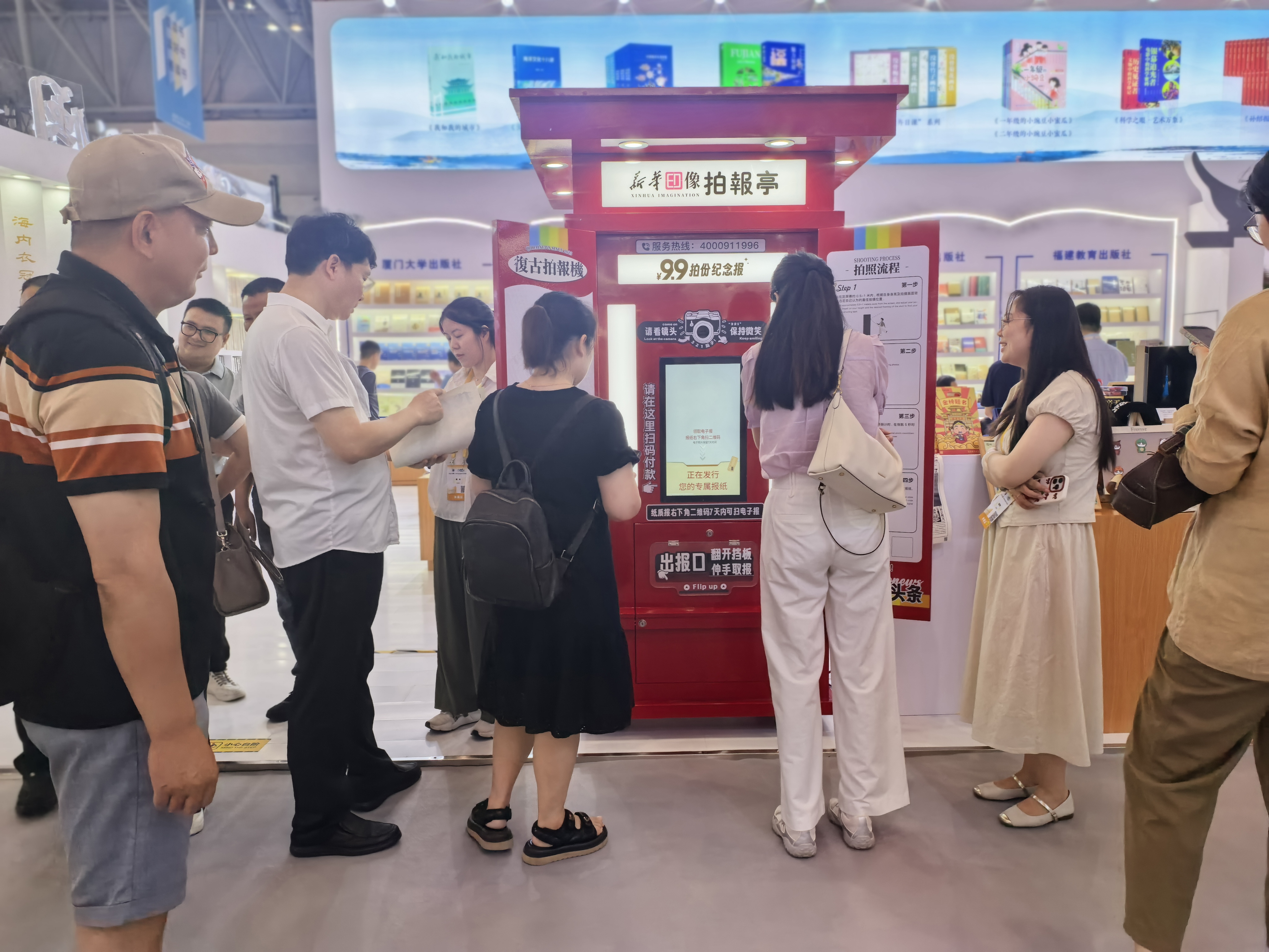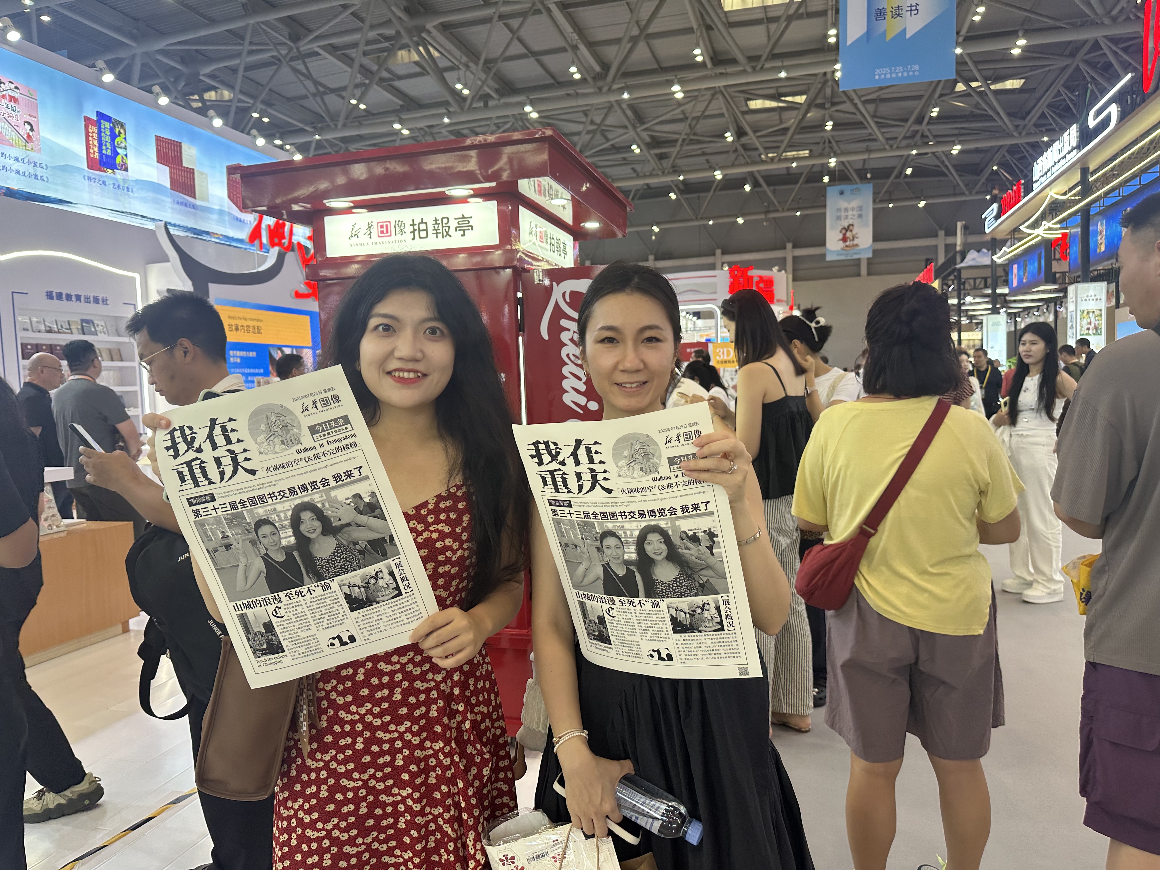展会现场的亮点之一,当属 “新华印像拍报亭”。其红色复古报亭造型与即时生成个性化纪念报纸的体验,完美契合怀旧情怀与个性化表达潮流,瞬间成为全场焦点。观众扫码后30秒即可获得一张以“我在重庆”为主视觉、融入重庆地标与个性标语的黑白风格纪念报纸,标注有书博会信息,成为独具意义的限定文化记忆载体。拍报亭前人流如织,观众纷纷分享至社交平台,使其迅速蹿升为热门“文化打卡点”,其新颖形式与文化价值更受到媒体广泛关注,新华网客户端、重庆之声视频号等平台均对此进行了报道。展会期间拍报亭还吸引了甘肃新华书店、新疆大学出版社、江苏凤凰新华书店等十余家省市级单位及文旅企业表达合作意向,这一创新互动形式,不仅聚拢超高人气,更在传播中有效助力“闽派”出版物及文化的推广。