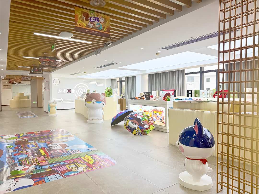 步入展厅,开放式的布局瞬间拉近了与参观者的体验距离,无需刻意规划路线,便可自由穿梭在文化创意的海洋中。最引人注目的当属特色风琴纸艺展架,其设计灵感源自蜂巢结构,不仅造型如画卷般舒展雅致,更将环保理念与艺术表达巧妙融合,每一件展品置于其上,都被晕染出独特的艺术气息,成为展厅内一道灵动的风景线。展厅的场景化布置更显匠心。自有 IP “夏格拉斯” 与 “非常家族”系列人偶装置憨态可掬,或立于展架旁,或藏在转角处,仿佛在与参观者互动;色彩鲜艳的道旗主题与地贴相互呼应,将各个展示区域串联起来,构建出一个充满活力的文化磁场。文艺气质与卡通趣味在此碰撞,让身处其中的人不自觉沉醉于这份独特的沉浸氛围。