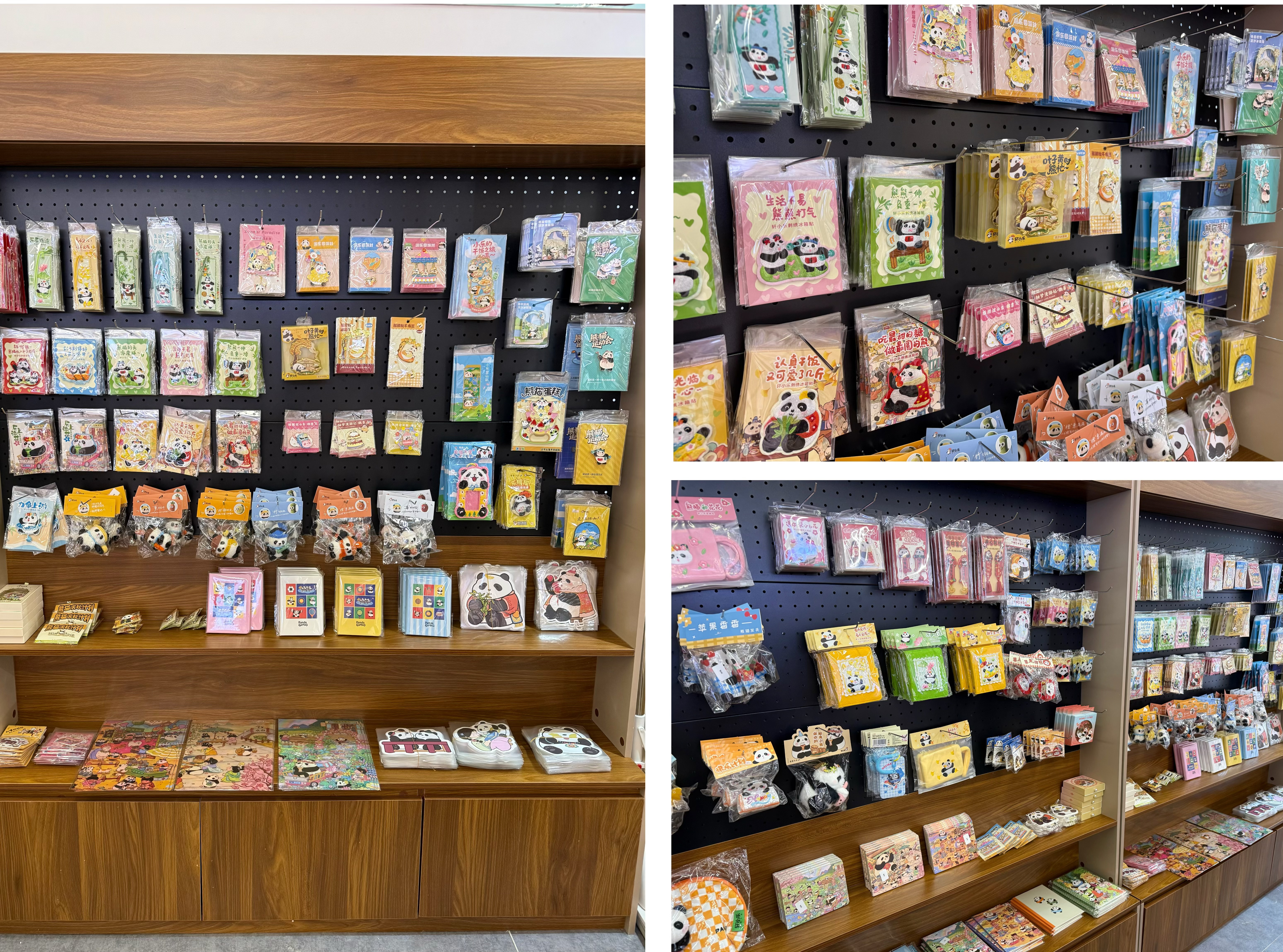 步入新华印像文创空间,传统与潮流的碰撞扑面而来,空间设计处处彰显巧思。将自有IP 夏格拉斯卡通形象与萌系熊猫融入顶部横幅插画,搭配书法字体与现代排版结合的品牌标识,让地域特色与年轻潮流自然衔接;浅原木色为主的空间材质,搭配灰色水泥地面与白色墙面,营造出“自然简约+文艺治愈”的温暖氛围,让每一件文创产品都尽显匠心;中央中岛展架打造360°开放式浏览动线,墙面磁吸式照片墙、格子展柜与洞洞板组成模块化展示,灵活适配多元文创品类陈列,兼顾实用性与视觉层次,为市民游客带来舒适的沉浸式逛展体验。