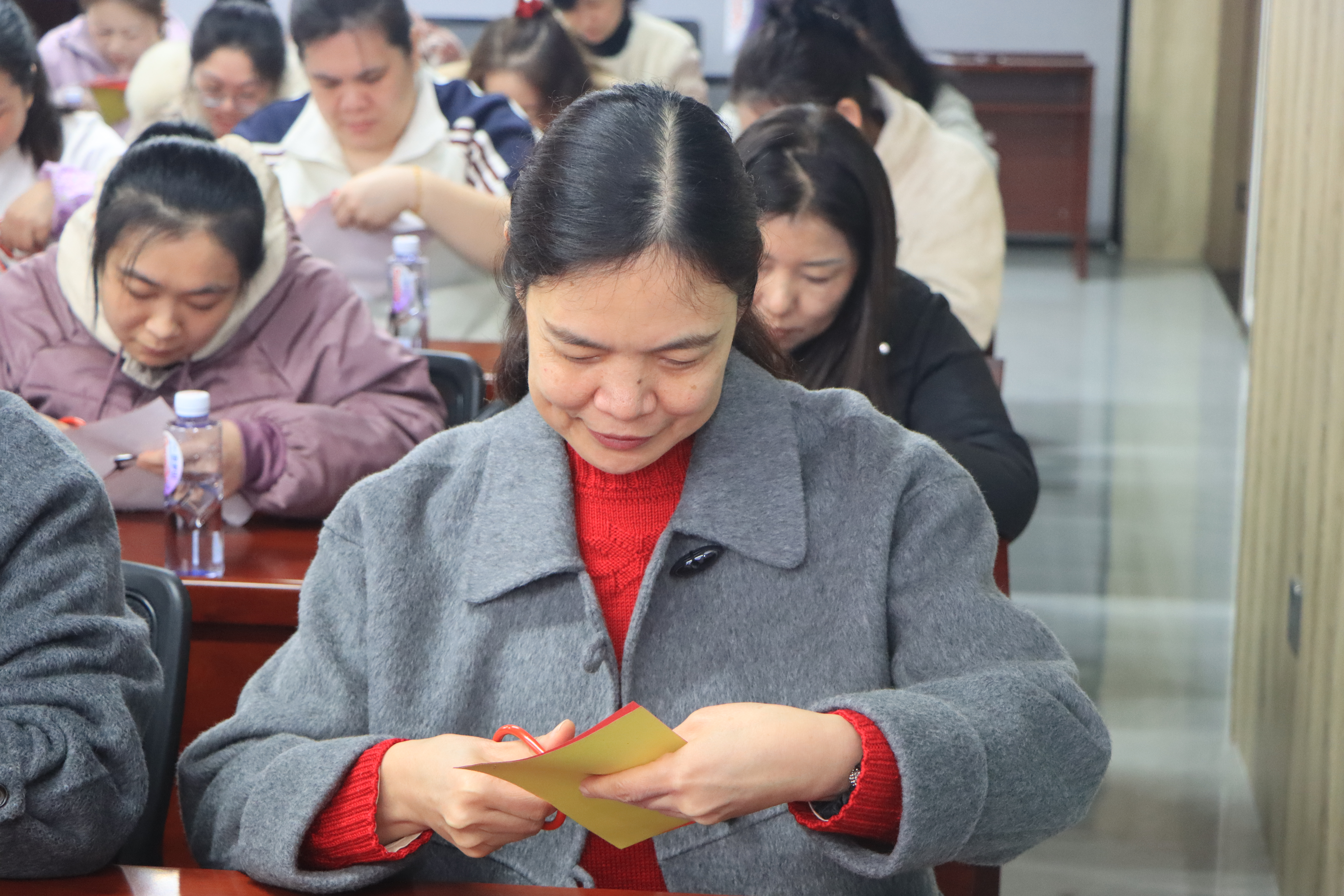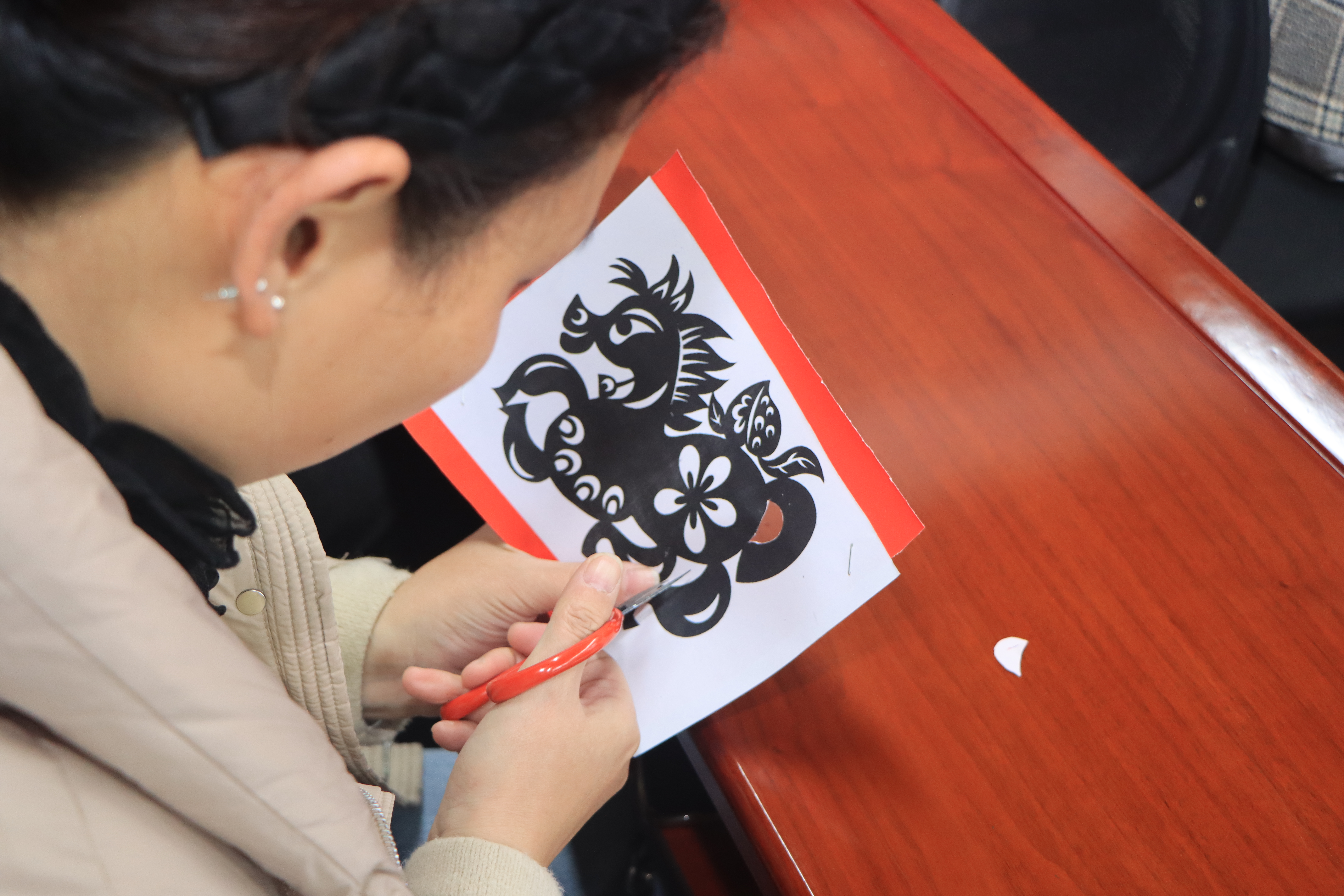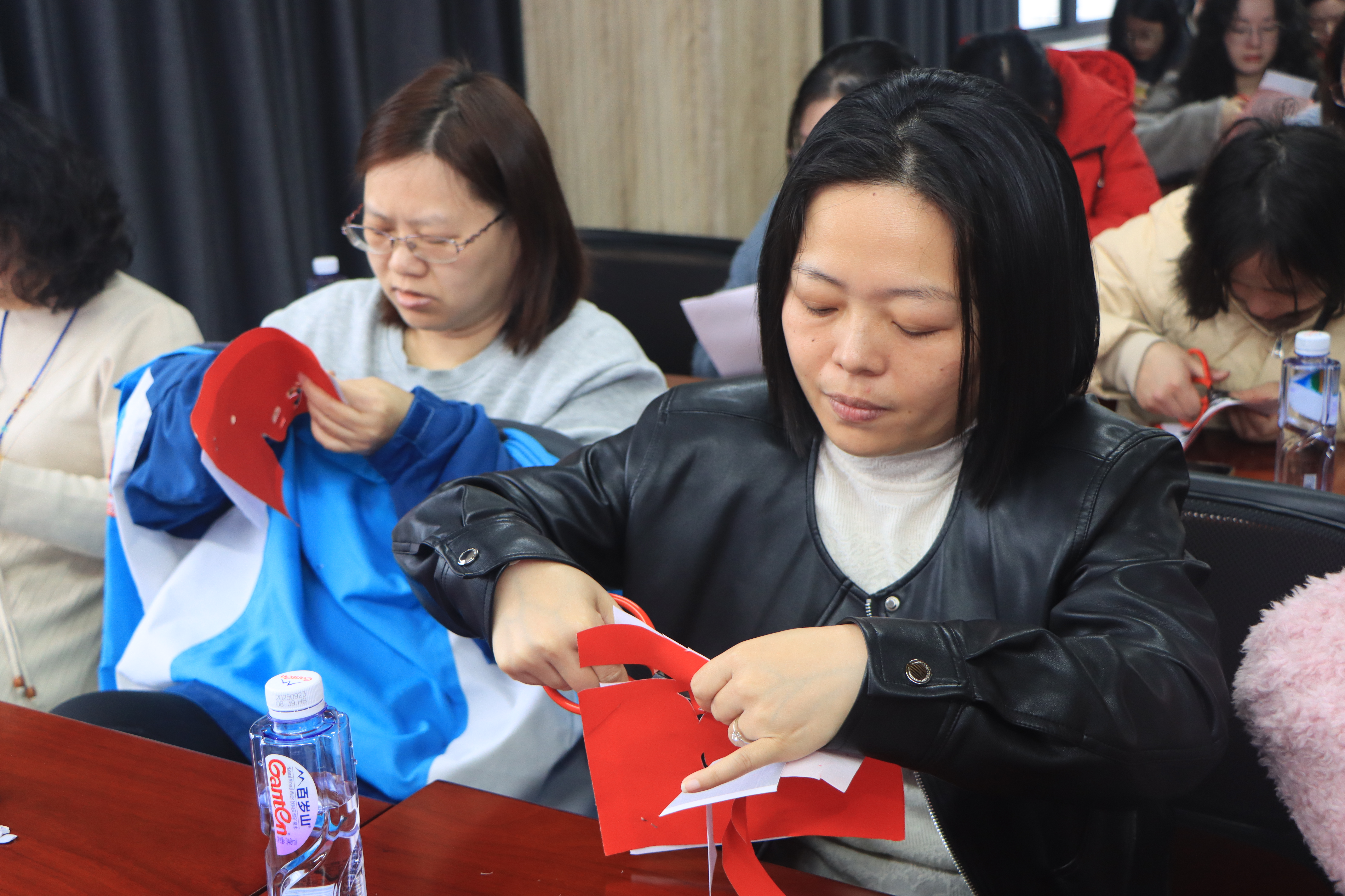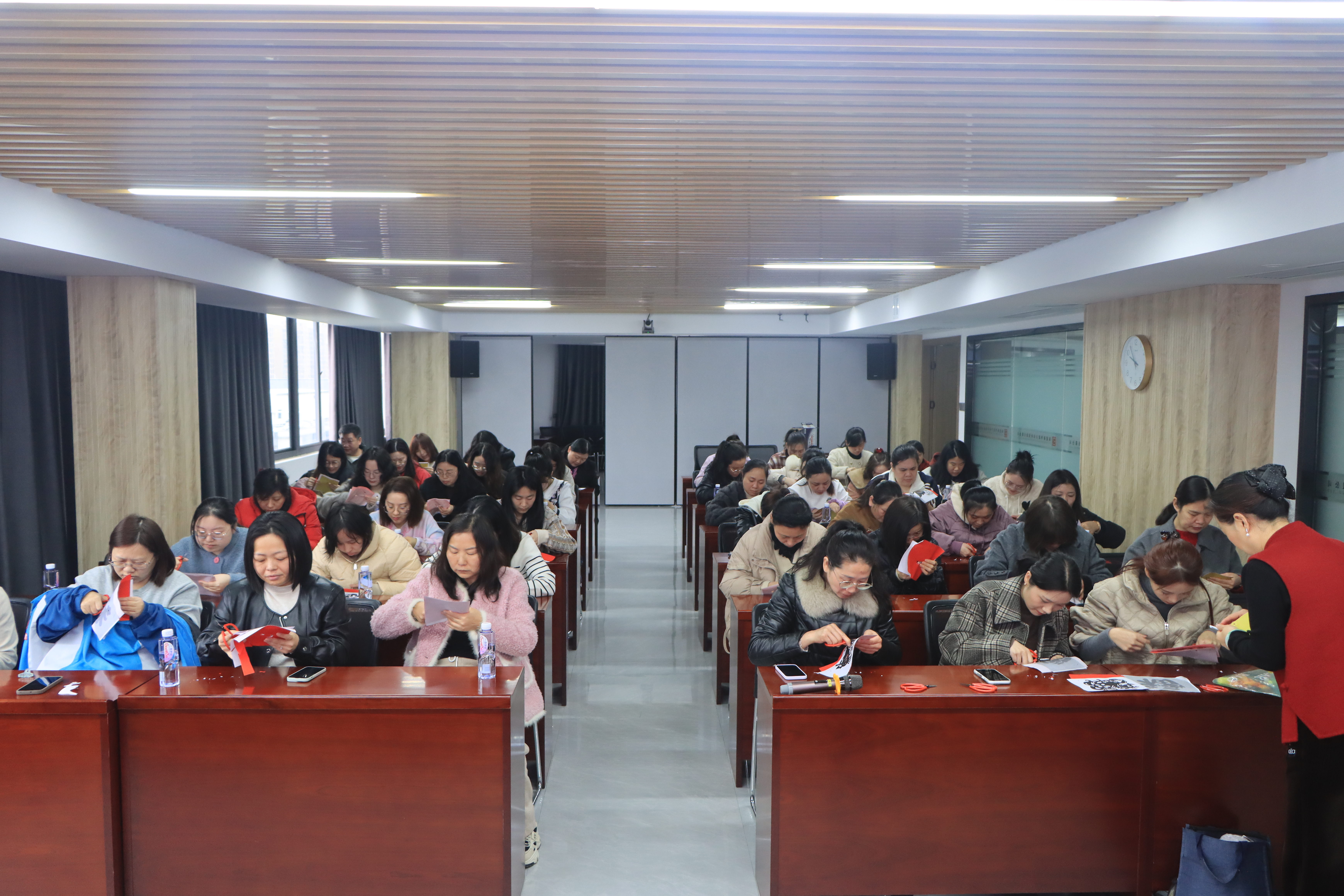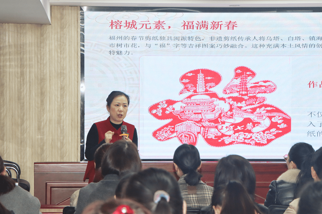 本次活动特邀剪纸艺术家、福州剪纸非遗传承人、福建省剪纸技能大师董雅萍亲临授课。董老师深入浅出地讲解了剪纸艺术的悠久历史、文化内涵与基础技法,并以娴熟灵动的手法现场示范,一张平凡的红纸在指尖翻转、剪裁、雕琢,顷刻化作寓意吉祥的精美纹样,让在场女职工直观领略到非遗剪纸的精巧神韵与独特魅力。