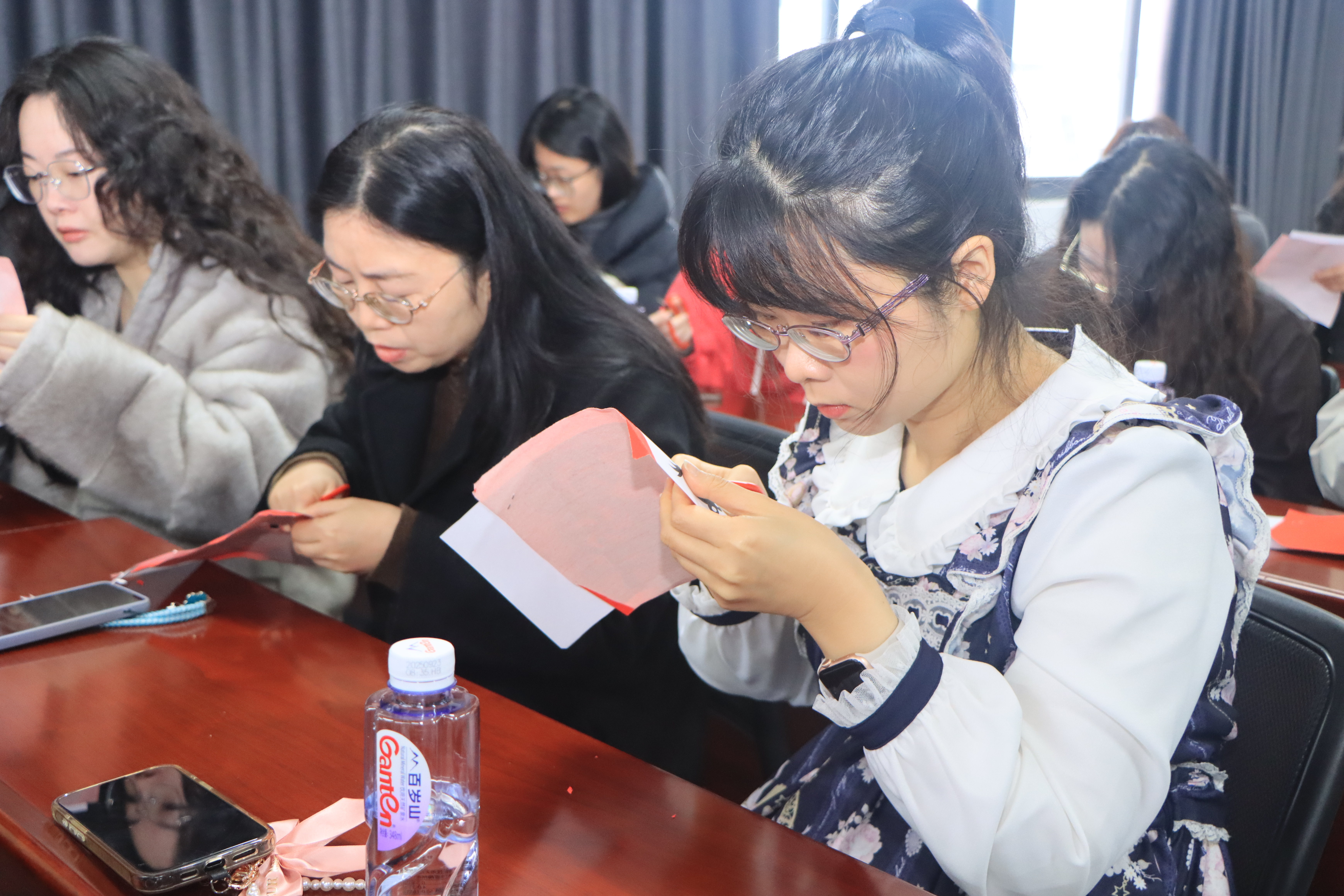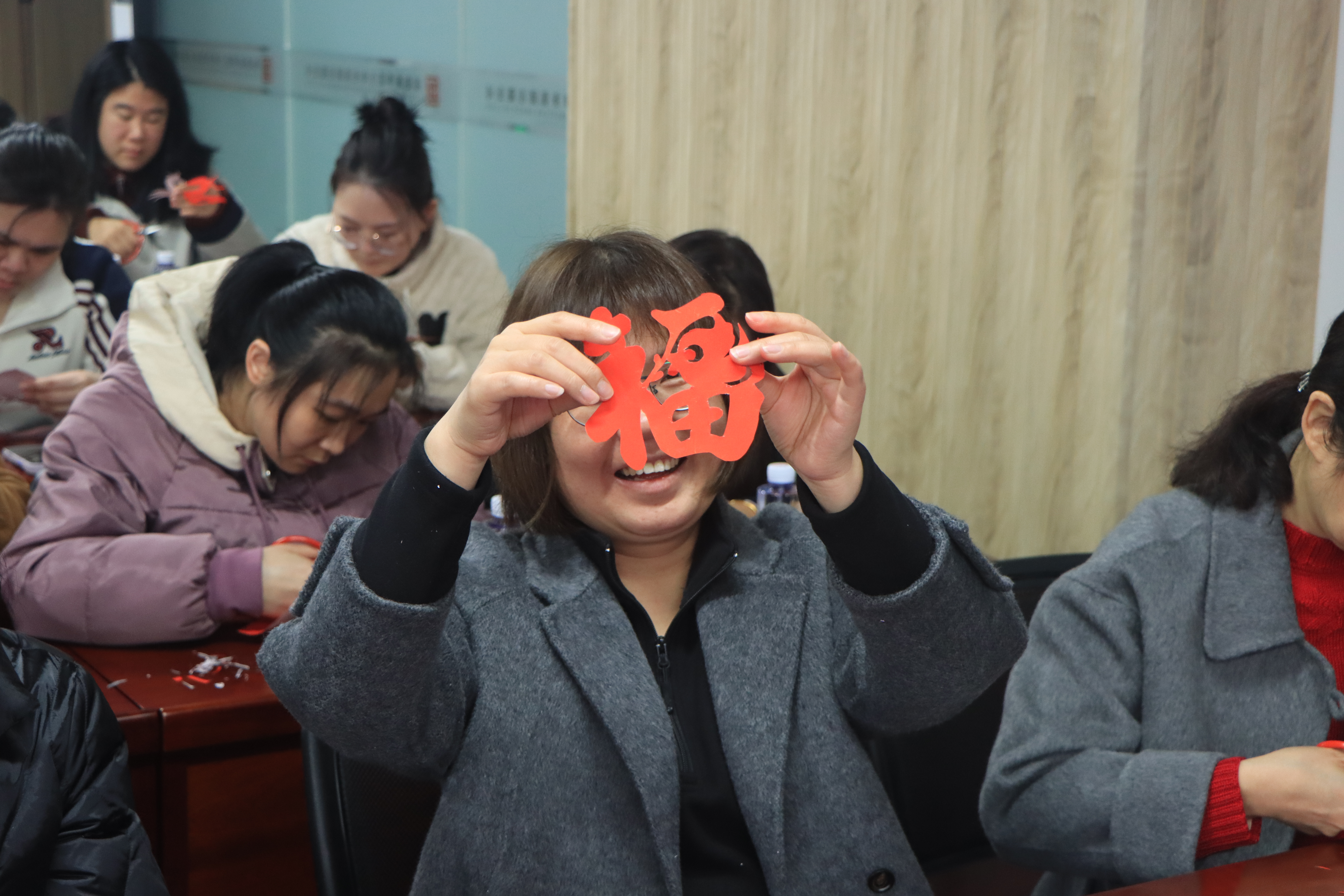 动手创作环节,女职工们全神贯注、沉浸其中,现场唯有剪刀轻裁红纸的沙沙声响,谱成一曲静谧雅致的匠心乐章。大家细心折叠、精准下刀,以匠心雕琢细节,用巧思勾勒纹样,片刻之间,灵动俊逸的骏马、端庄大气的“福”字、祥瑞生动的祥龙图案便跃然纸上。随后,大家将作品精心装裱于卡纸,打孔系上中国结与流苏,一件件兼具传统韵味与节日气息的剪纸挂饰匠心天成、美不胜收。活动尾声,女职工们手持亲手创作的作品合影留念,笑容与红纸相映,定格下美好而难忘的瞬间。